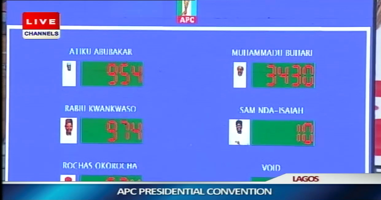 Buhari scored 3,430 votes to defeat other aspirants; former Vice President, Atiku Abubakar (954 votes); Governor of Kano State, Rabiu Kwankwaso (974 votes); Imo State Governor, Rochas Okorocha (624 votes) and the Publisher of Leadership Newspapers, Sam Nda-Isaiah (10 votes) with 16 votes recorded as invalid.
