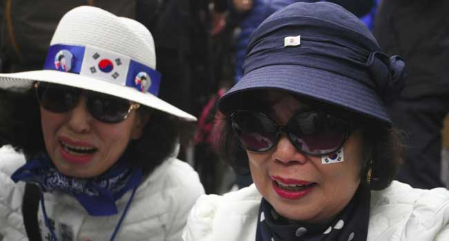 Supporters of South Korea’s former President Park Geun-hye cry during a rally outside the Seoul Central District Court. PHOTO: JUNG YEON-JE / AFP