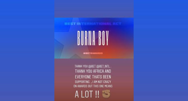 Following his big win at the 2019 BET Awards, Burna Boy has thanked organisers and Africans for their support.