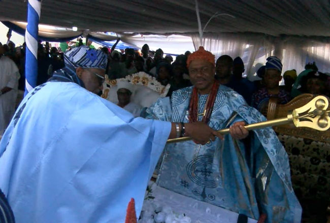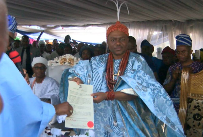 The Olowo of Owo, Ondo State, Oba Ajibade Gbadegesin Ogunoye III, has been presented with the staff and instrument of office from the state Governor, Rotimi Akeredolu.