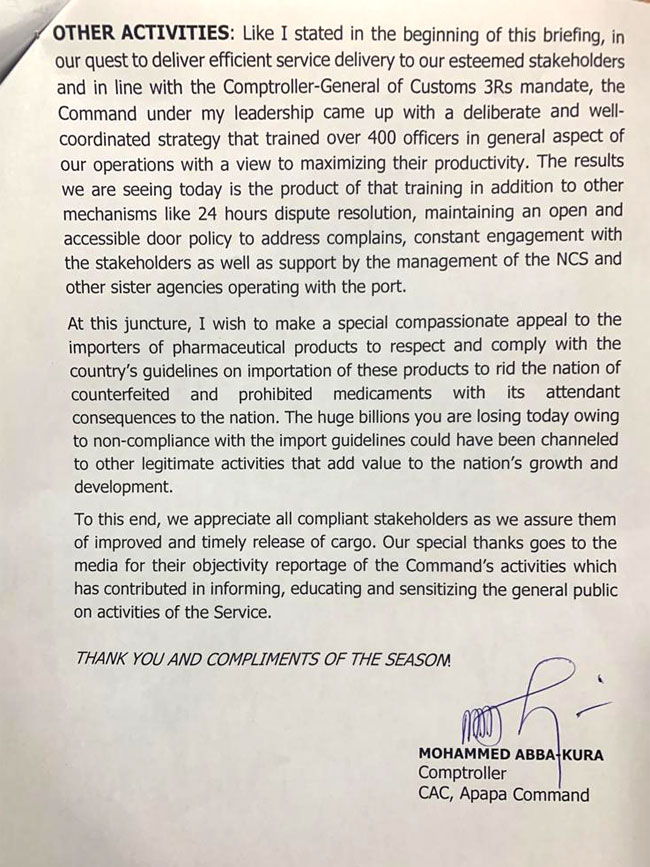 “I am pleased to inform you that the Command has once again set up another record by meeting and surpassing its 2019 annual revenue target of N372 billion with over N41 billion and seized goods worth over N12 billion,” Abba-Kura said
