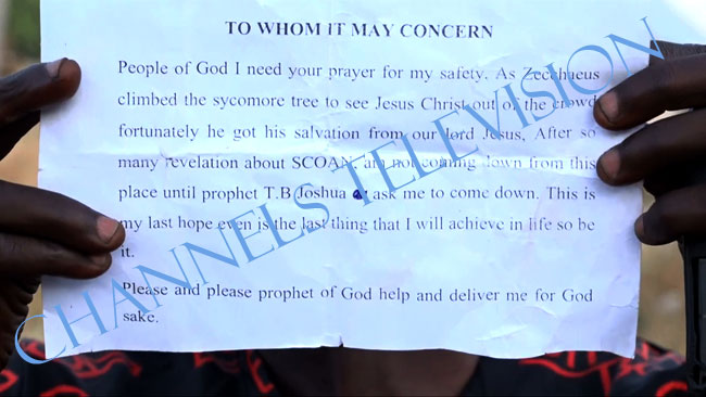 “After so many revelations about SCOAN, I am not coming down from this place until prophet T.B. Joshua asks me to come down. This is my last hope even if it is the last thing that I will achieve in life, so be it.