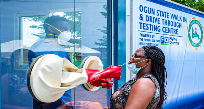 The glass box is a Walk-in & Drive-through Testing Centre located at the Ijamido Town Hall, in Ota.
