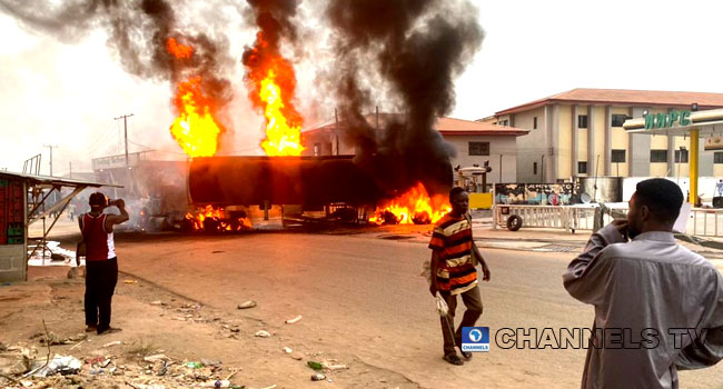 A combination of photos from the scene of the tanker explosion along the Alagbole-Akute Road in Ogun State on March 6, 2021. Channels Television/ Taiwo Adesina.