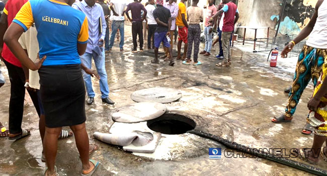 A photo taken on March 6, 2021 shows the opening to the underground storage tank at the NNPC retail station along the Alagbole-Akute road in Ogun State. Channels TV/ Taiwo Adesina.