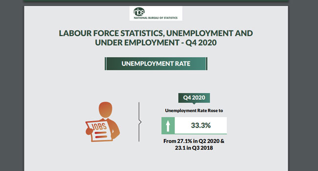 Nigeria’s unemployment rate has increased from 27.1% to 33.3% in the fourth quarter of 2020.