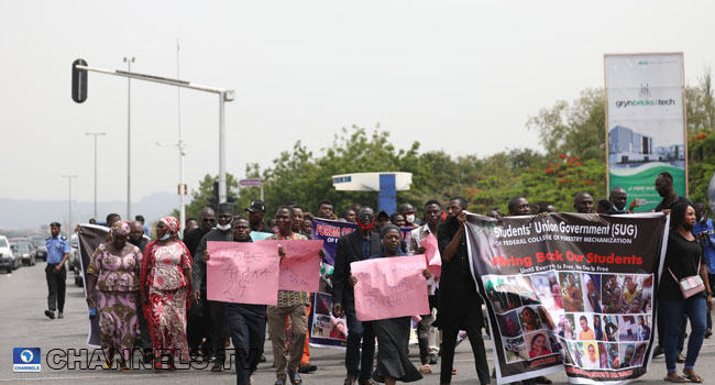 The protesters which include members of the Students Union Government (SUG) of the institution are lamenting over what they described as the negligence of the state and Federal Government in securing the release of the children.