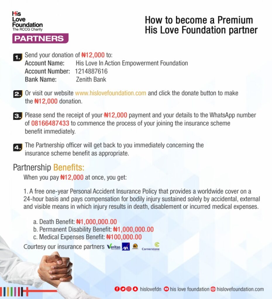 In addition, the HLF has entered into partnerships with 4 Insurance companies in Nigeria to give 1year free Accident Insurance Policy to partners who make lump sum donations of #12,000 or more at once.