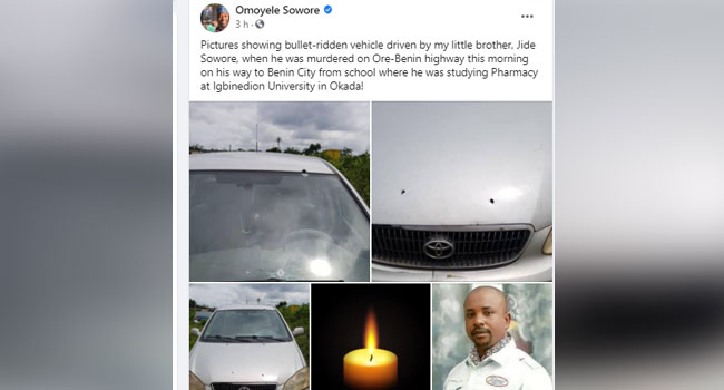 The Edo State Police Command has confirmed the murder of Olajide Sowore, brother of Sahara Reporters Publisher, Omoyele Sowore by suspeced kidnappers around 6:00 a.m. on Saturday.