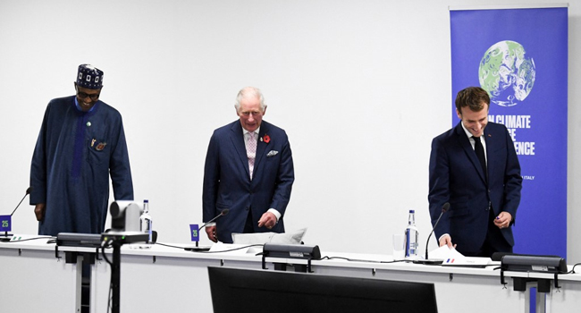 (From L) President Buhari, Britain’s Prince Charles, Prince of Wales and France’s President Emmanuel Macron having a conversation prior to a meeting as part of the World Leaders’ Summit of the COP26 UN Climate Change Conference in Glasgow on November 1, 2021. ALAIN JOCARD / AFP
