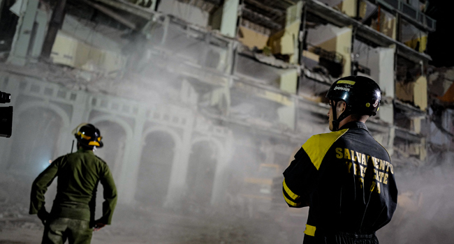Firefighters and rescue workers remove debris from the ruins of the Saratoga Hotel, in Havana, on May 6, 2022. ADALBERTO ROQUE / AFP