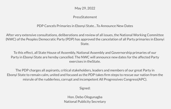 “To this effect, all State House of Assembly, National Assembly, and Governorship primaries of our Party in Ebonyi State are hereby cancelled. The NWC will announce new dates for the affected Party exercises in the state,” the statement read in part.