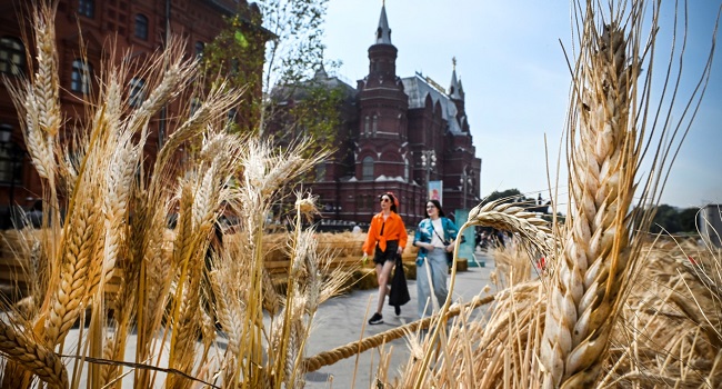 (FILES) Pedestrians walk past wheat ears art installation on the edge of the Red Square in central Moscow on August 27, 2022. (Photo by Alexander NEMENOV / AFP)