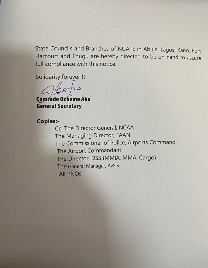 The union made this known in a circular obtained by our reporter and addressed to the Director-General Civil Aviation (DGCA); Managing Director, Federal Airports Authority of Nigeria (FAAN), Commissioner of Police, Airports Command, the Airport Commandant, Director, Department of State Security (DSS), Murtala Muhammed International Airport (MMIA), Lagos Command.