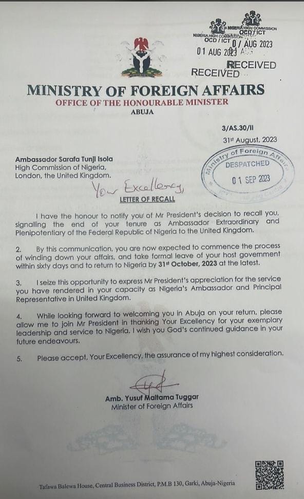However, the Minister of Foreign Affairs, Amb. Yusuf Maltama Tuggar, in a letter dated August 31, 2023, stated that the decision signalled the end of Ishola’s tenure as Ambassador Extraordinary and Plenipotentiary of the Federal Republic of Nigeria to the United Kingdom.