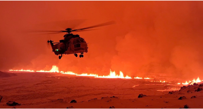 Live-streamed footage of the eruption showed glowing orange jets of lava spewing from a gash in the ground, surrounded by billowing clouds of red smoke.