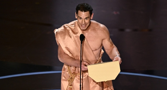 Eventually, the impressively toned Cena shuffled out wearing only sandals and shielding himself with the winner’s envelope, bringing the house down as he shuffled to centre stage.