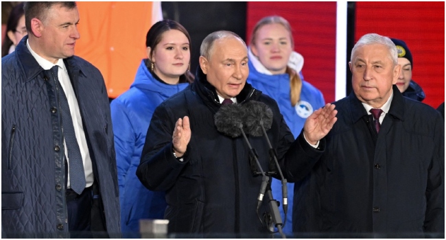 President Vladimir Putin hailed the “return” to Russia of annexed Ukrainian territories on Monday at a concert on Red Square after winning an election blasted as illegitimate by Western powers.