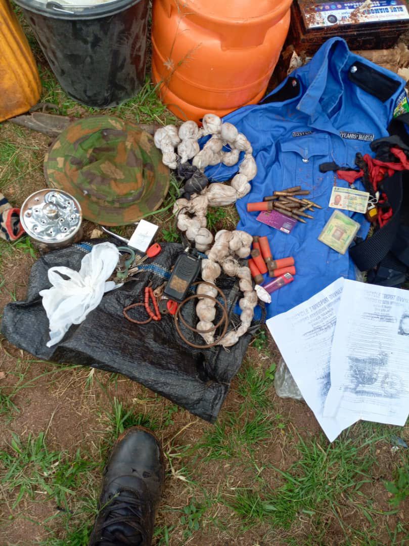High-calibre ammunition, catridges, a locally fabricated rocket launcher, police uniforms and one Ford Pick-Up Truck without number plates were recovered.