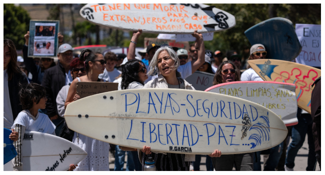 Dozens of surfers protested in Ensenada on Sunday with messages written on their boards including “beaches, security, freedom, peace” and “no more deaths.”