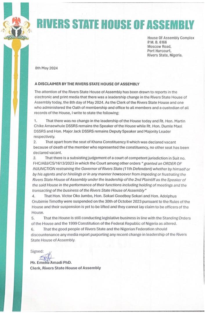 In a six point statement signed by Emeka Amadi, the clerk of the Rivers State House of Assembly, the statement said there was no change in leadership structure of the House as Martin Amaewhule, Dumle Maol, and Major Jack remain Speaker, Deputy Speaker, and Majority Leader respectively.