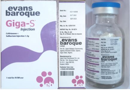 Giga–S injection Ceftriaxone + Sulbactam Inj.1.5g IM/IV is indicated for the treatment of severe infections due to susceptible organisms including septicemia; pneumonia; and meningitis.