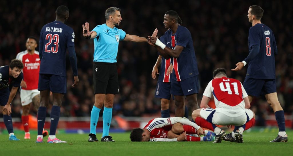 Donnarumma made a fine save to keep out Martinelli’s volley soon after the interval, but PSG were inches away from grabbing a lifeline when Joao Neves’ effort smacked off the bar.