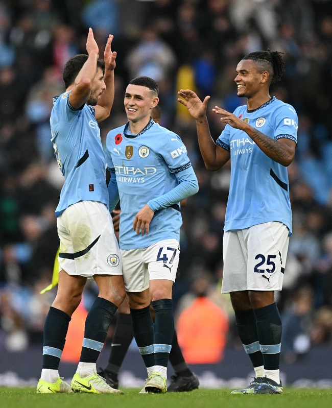 Manchester City’s Portuguese defender #03 Ruben Dias (L) Manchester City’s English midfielder #47 Phil Foden (C) and Manchester City’s Swiss defender #25 Manuel Akanji (R) celebrate at the end of the game during the English Premier League football match between Manchester City and Southampton at the Etihad Stadium in Manchester, north west England, on October 26, 2024.  (Photo by Oli SCARFF / AFP)