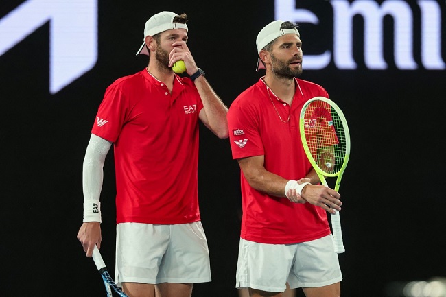 Italy’s Andrea Vavassori and Italy’s Simone Bolelli react as they play against Finland’s Harri Heliovaara and Britain’s Henry Patten during the men’s doubles final match on day fourteen of the Australian Open tennis tournament in Melbourne on January 26, 2025. (Photo by DAVID GRAY / AFP) / — IMAGE RESTRICTED TO EDITORIAL USE – STRICTLY NO COMMERCIAL USE —