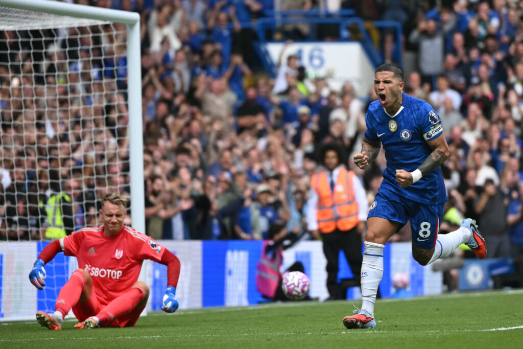 Fulham’s German goalkeeper #01 Bernd Leno reacts as Chelsea’s Argentinian midfielder #08 Enzo Fernandez (R) celebrates scoring their second goal from the penalty spot during the English Premier League football match between Chelsea and Fulham at Stamford Bridge in London on August 30, 2025. (Photo by JUSTIN TALLIS / AFP)