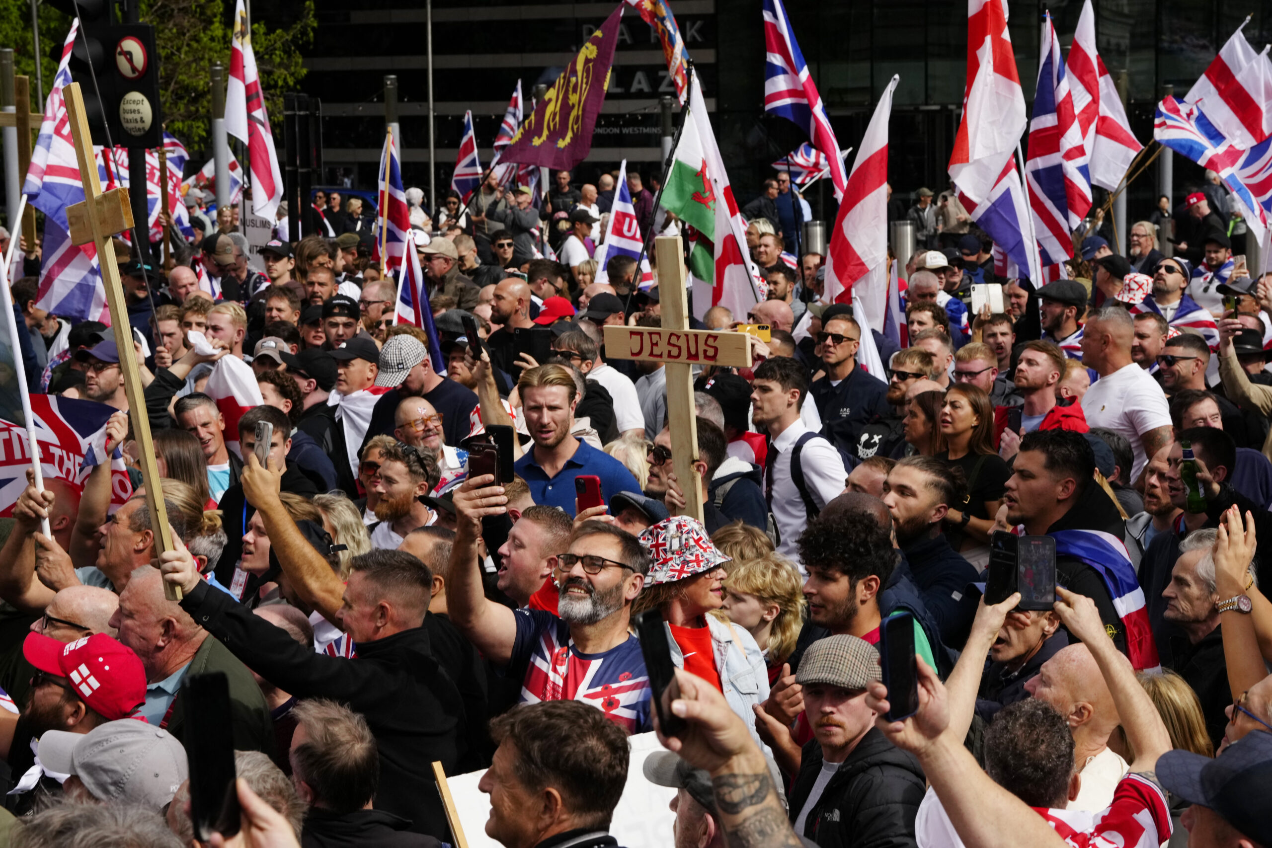His latest “Unite the Kingdom” event saw attendees march over Westminster Bridge before rallying near Downing Street for speeches by far-right figures from across Europe and North America.