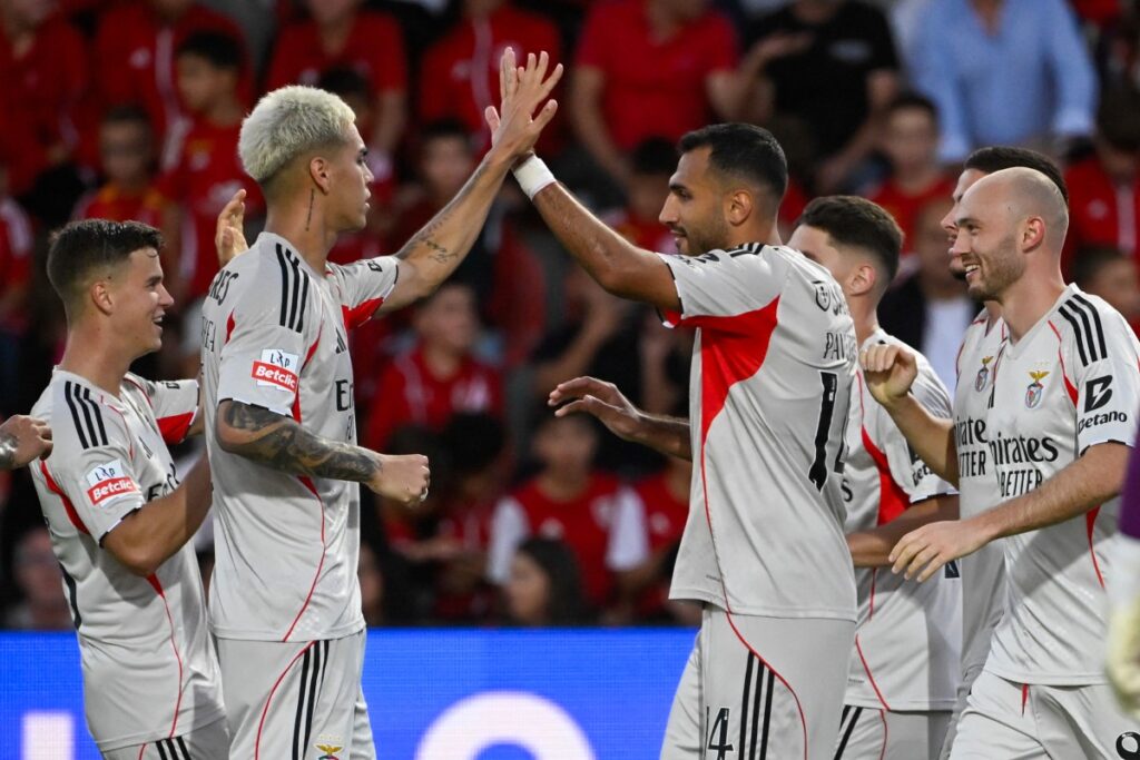 Benfica’s Greek forward #14 Vangelis Pavlidis (C) celebrates with teammates after scoring their second goal during the Portuguese League football match between AVS Futebol SAD and SL Benfica at CD Aves stadium in Vila das Aves, on September 20, 2025. (Photo by Miguel RIOPA / AFP)