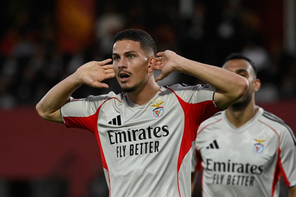 Benfica’s Croatian forward #09 Franjo Ivanovic celebrates after scoring their third goal during the Portuguese League football match between AVS Futebol SAD and SL Benfica at CD Aves stadium in Vila das Aves, on September 20, 2025. (Photo by Miguel RIOPA / AFP)