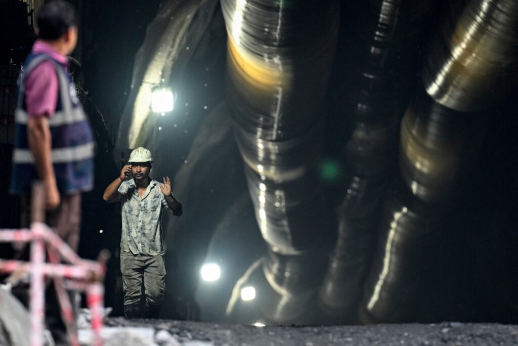 This photograph, taken on August 22, 2025, shows labourers working at the under-construction site of the Dibang Multi-purpose Hydroelectric Project on the Dibang River, in the Lower Dibang Valley district of the northeastern state of Arunachal (Photo by Arun SANKAR / AFP)