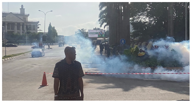 Protesters chanted, “Free Nnamdi Kanu now,” “It’s our constitutional right to protest,” and “Don’t tear gas us,” before security forces fired shots and tear gas, forcing them to flee.