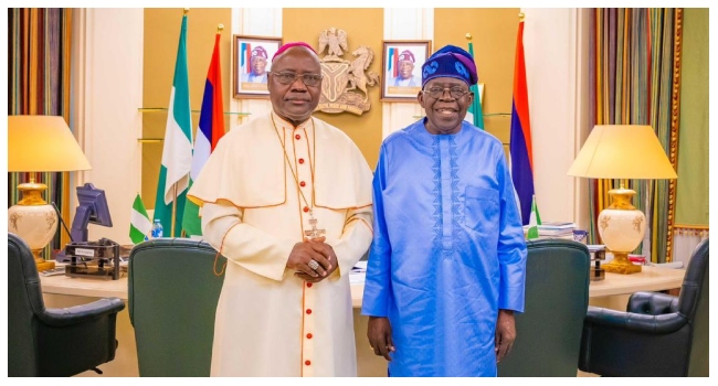 President Bola Tinubu on Tuesday met with the Catholic Archbishop of Abuja, Ignatius Kaigama, at the Presidential Villa in the nation’s capital.