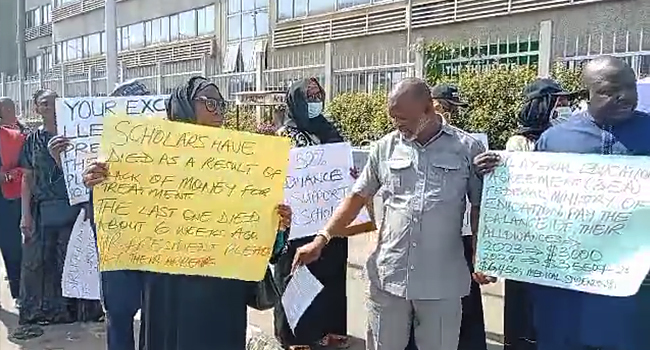Parents of student beneficiaries of the Federal Government’s Bilateral Education Agreement (BEA) Scholarship Programme have staged a protest at the Federal Ministry of Finance in Abuja over the non-payment of 16 months of arrears of living allowances.