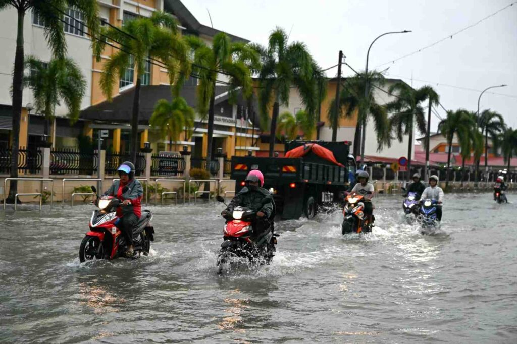 Motorists on scooters make their way through flood waters in Kangar in northern Malaysia’s Perlis state on November 26, 2025, as severe flooding affected thousands of people in the region following days of heavy rain. (Photo by MOHD RASFAN / AFP )