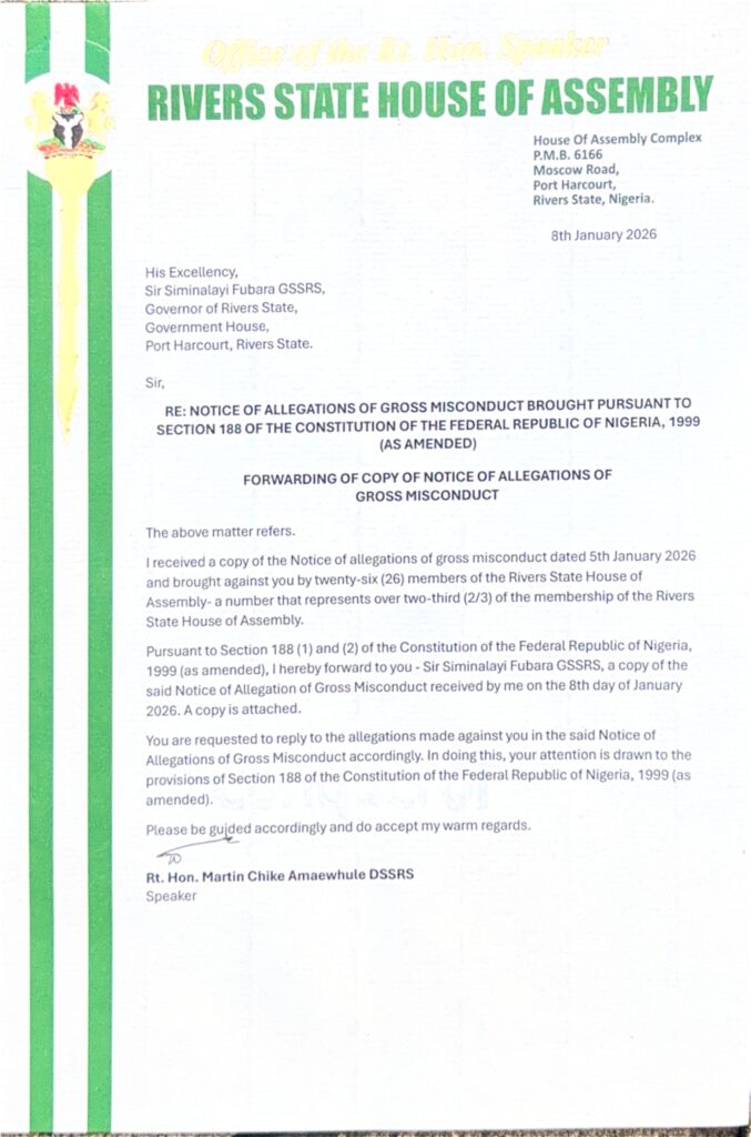 Twenty-six members of the Rivers State House of Assembly signed the notice.