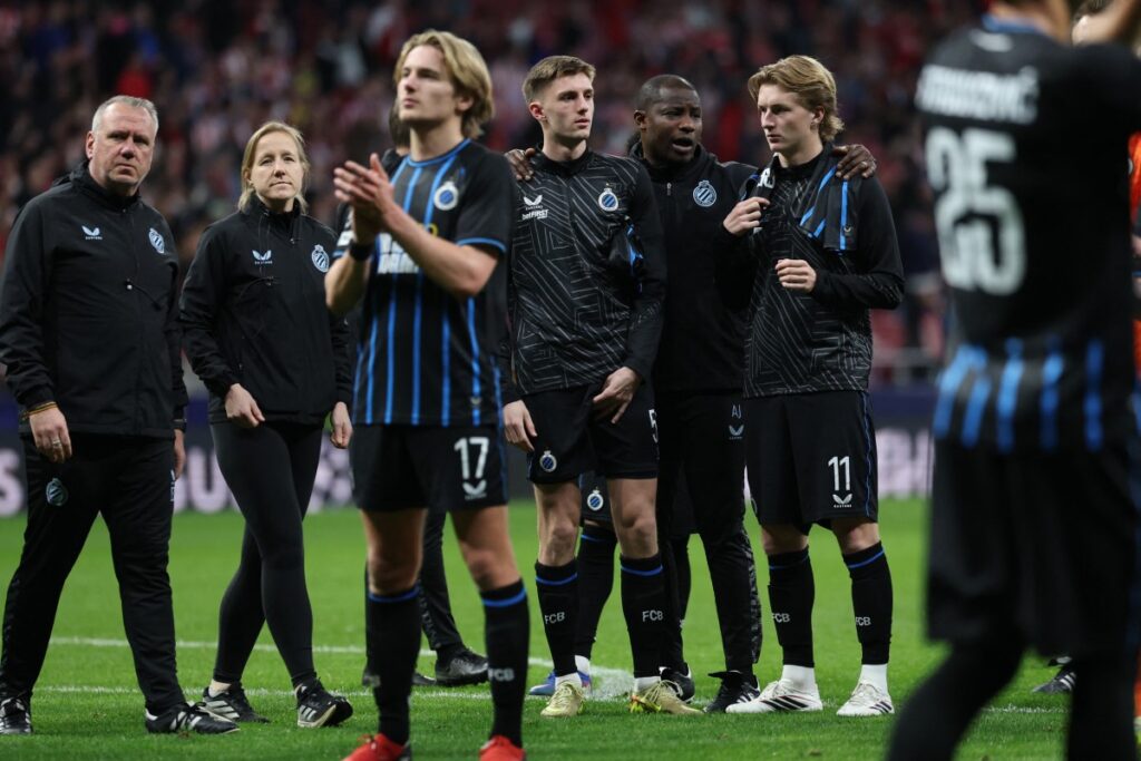 Club Brugge’s players react after the UEFA Champions League knockout round play-off second leg football match between Club Atlético de Madrid and Club Brugge KV at Metropolitano Stadium in Madrid on February 24, 2026. (Photo by Thomas COEX / AFP)